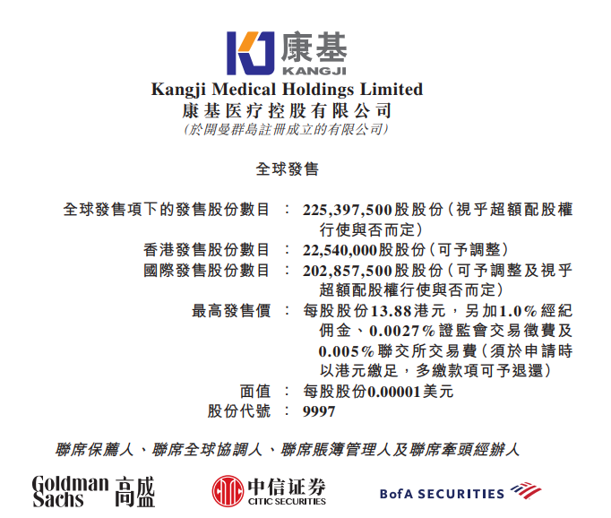 康基医疗(09997)于2020年6月16日-6月19日招股,公司拟发行2.25亿股股份,公开发售占10%,国际配售占90%,另有15%超额配股权。每股12.36港元-13.88港元,每手500股,入场费7009.94元。预期将于6月29日上市。