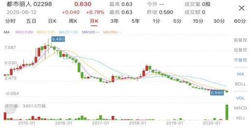 截至6月12日收盘,都市丽人的股价为0.63港元,只及2015年9月最高点的零头。2019年全年,都市丽人股价下跌近6成,2020年年内续跌了近5成,股价呈45度下滑趋势。