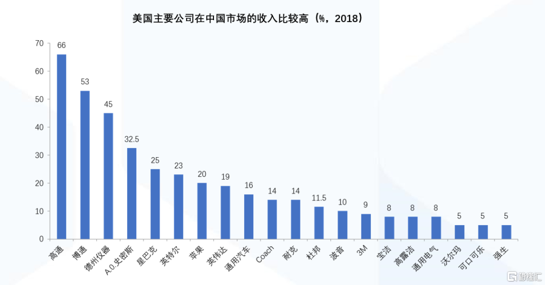 我们可以看到,今天美国大部分公司在中国市场的收入已经占比非常高,比如高通,60%以上的收入都来自于中国。