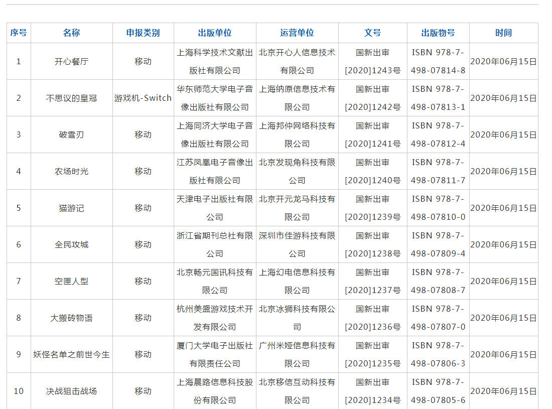 36氪获悉,国家新闻出版署官网显示,6月第一批共55款游戏获得国产游戏版号。腾讯的Switch主机游戏《不思议的皇冠》获批,另有三七互娱的《上古之神》《异能都市》、世纪华通的《庆余年》、游族网络的《新盗墓笔记》、创梦天地的《雏蜂:深渊天使》、哔哩哔哩的《空匣人型》均获得版号。