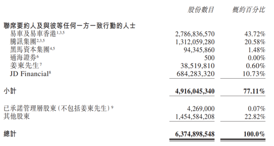 根据易鑫集团公告,易车持有公司43.72%的股权,拥有53.72%的表决权;腾讯持有公司20.58%的股权,拥有10.58%的表决权;黑马资本持股1.48%,京东持股10.73%。