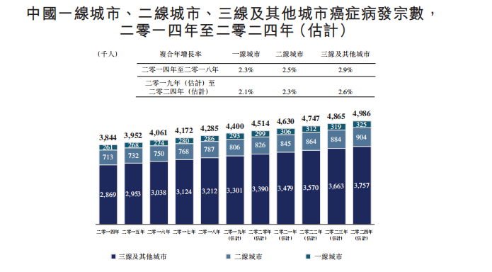 由于生活和工作压力越来越大,加上不健康的生活习惯,中国癌症病发宗数由二零一四年的约3.8百万人增至二零一八年的约4.3百万人,乃全球最高。预期二零二四年将达约5.0百万人。三线及其他城市占中国癌症病发宗数最大比例。然而,在中国,最近五年的存活率仅为40.5%,远低于美国的66.9%。过去五年,中国每年癌症死亡人数由二零一四年的约2.3百万人增至二零一八年的约2.6百万人,估计二零二四年将达约3.0百万人。