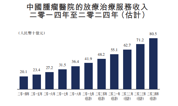 与整体肿瘤医疗服务市场相比,按肿瘤医院所得收入计,放疗治疗服务市场呈更快增长。肿瘤医院放疗治疗服务产生的收入由二零一四年的人民币201亿元增至二零一八年的人民币364亿元,复合年增长率为15.9%,预期由二零一九年的人民币419亿元进一步增至二零二四年的人民币805亿元,复合年增长率为14.0%。