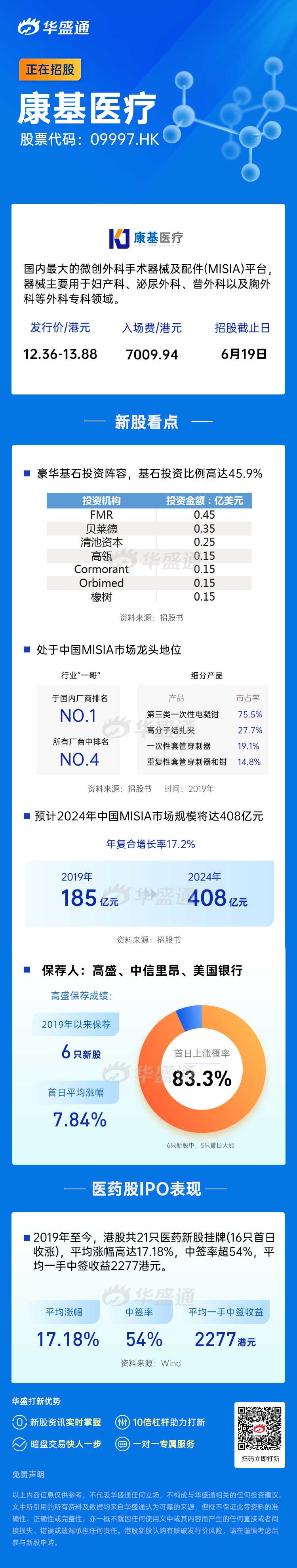 国内最大的微创外科手术器械(MISIA)平台康基医疗(09997)于2020年6月16日-6月19日招股,公司拟发行2.25亿股股份,公开发售占10%,国际配售占90%,另有15%超额配股权。每股12.36港元-13.88港元,每手500股,入场费7009.94元。预期将于6月29日上市。