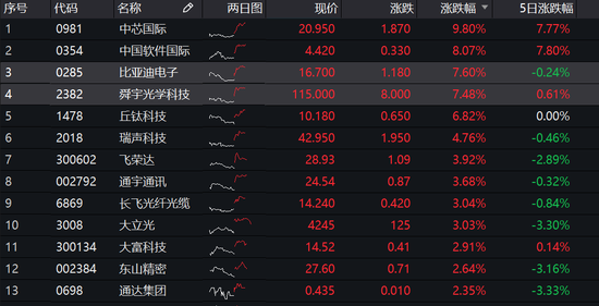 华为概念股集体爆发,其中,中兴通讯暴涨14%,中芯国际大涨10%,中国软件国际涨8%,比亚迪电子、舜宇光学涨超7%,丘钛科技涨近7%,瑞声科技涨近5%。