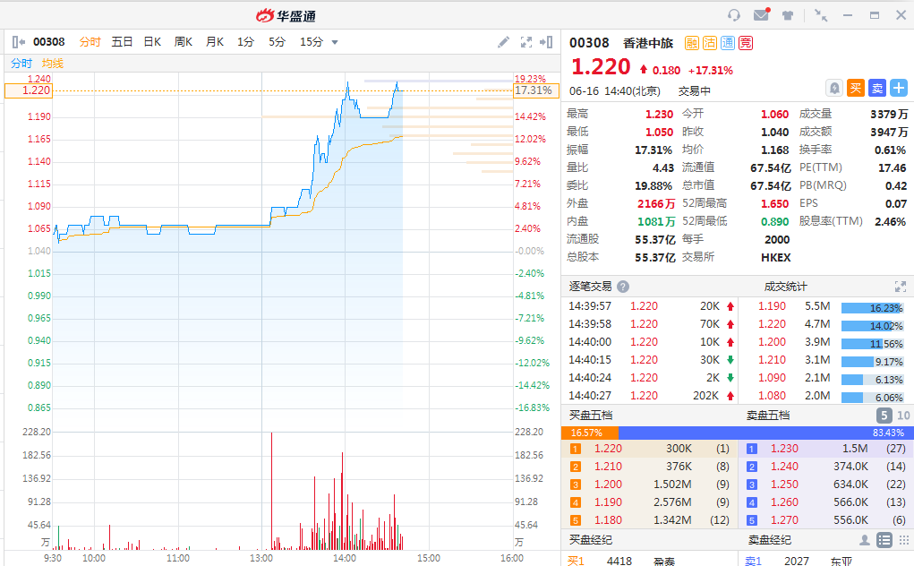 香港中旅(00308.HK)午后急涨至16.35%,报1.21港元,成交量放大至2355万港元,最新总市值67亿港元。