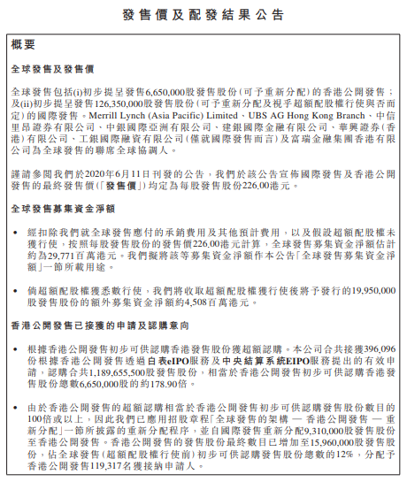国际发售与香港公开发售的最终发售价均已确定为每股股份226.00港元。