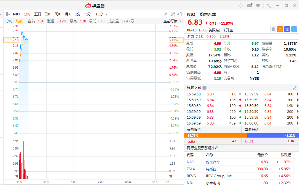 周二(6月16日)美股盘前,蔚来(NIO.US)涨超5%,截至北京时间16:20,该股涨5.12%,报7.18美元。