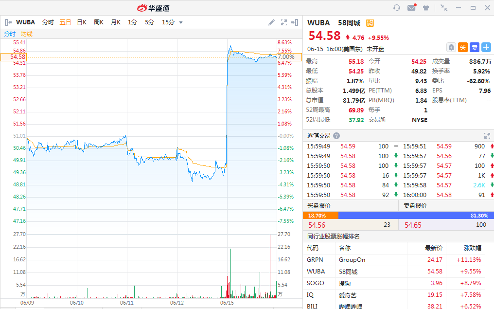 受此消息影响,58同城昨晚大幅拉升,截止收盘股价大涨9.55%至54.58美元,总市值为81.8亿美元。