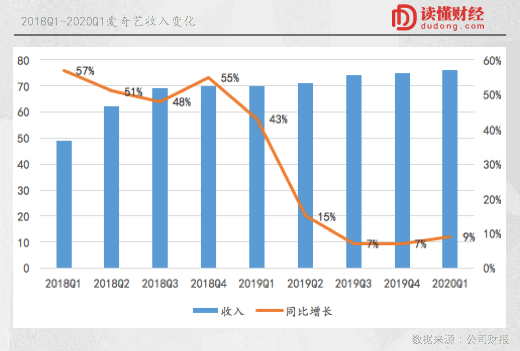 从收入看,自2019年三季度开始,爱奇艺收入为74亿元,收入增速首次低于10%,此后两个季度这样的局面并没有得到太多改善。