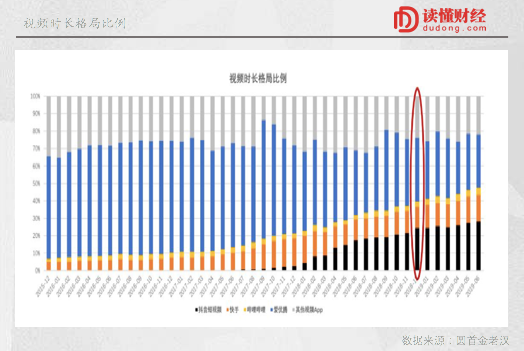 从数据上看,在2018年12月,抖音、快手的单月时长在视频领域的占比第一次超过了爱优腾三家。某种程度上说,短视频对长视频的广告份额争夺,付费会员渗透率的天花板,也不过是时长份额争夺的必然结果之一。