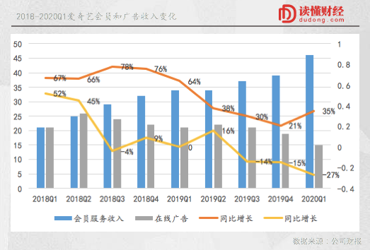 具体来看,爱奇艺的收入主要来自两个业务:会员和广告。2019年两块业务交出了截然不同的成绩。