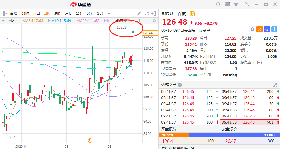 百度高开近9%,截至发稿,涨8.27%,报126.48美元。