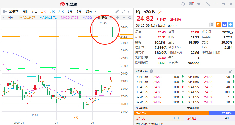 华盛资讯6月16日消息,受腾讯计划入股爱奇艺消息刺激,爱奇艺盘前一度涨超40%,截至北京时间21:41,爱奇艺涨近30%,报24.82美元,市值超182亿美元。