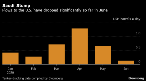 媒体汇编的油轮追踪数据显示,6月份到目前为止,沙特仅向美国出口了一船原油,这相当于该国4月份输美原油每天约130万桶的十分之一,当时沙特在与俄罗斯的短暂油价战中向全球大量输出原油。