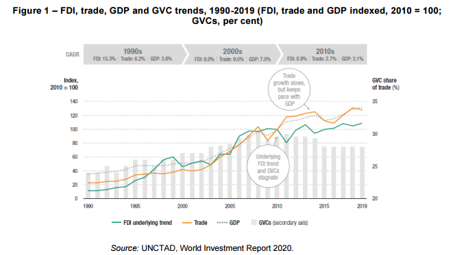 报告指出,UNCTAD已经对FDI和跨国企业的活动进行了30年的跟踪分析。在过去30年中,国际生产体系经历了重大转变。而尽管在2008年全球金融危机之后经济出现了短暂的复苏,但跨境投资停滞不前,贸易增长乏力,全球价值链增长放缓。
