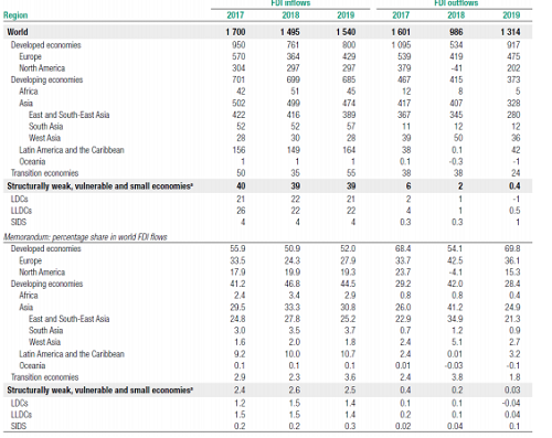报告指出,2019年出现FDI增长的情况主要是由于随着美国2017年税制改革影响的减弱,流入发达经济体的投资增加。流入转型经济体的外资也有所增加,而流入发展中经济体的外资则略有下降。流向结构薄弱和脆弱经济体的外国直接投资总体上保持稳定,仅下降了 1%。
