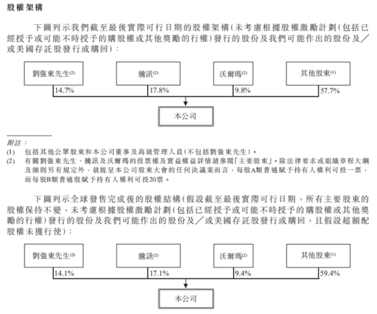 招股书披露,上市前京东采用同股不同权架构:腾讯为京东第一大股东,股权占比17.8%,投票权为4.6%;刘强东持股14.7%,投票权为78.4%,仍是京东掌舵手;沃尔玛股权占比9.8%,投票权为2.5%。
