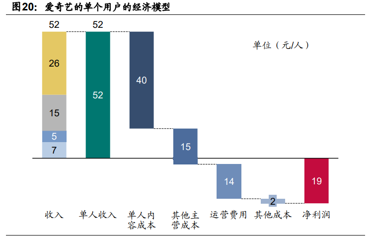 成本端目前爱奇艺的问题在于52元的ARPU值当中有40元用于内容成本,内容成本占比超过76%,而其他的主营成本让毛利率为负数,其他运营费用单人亏损14元,因此公司单人净亏损约为19元/人。因此在成本端,公司的核心要点就是优化内容成本。