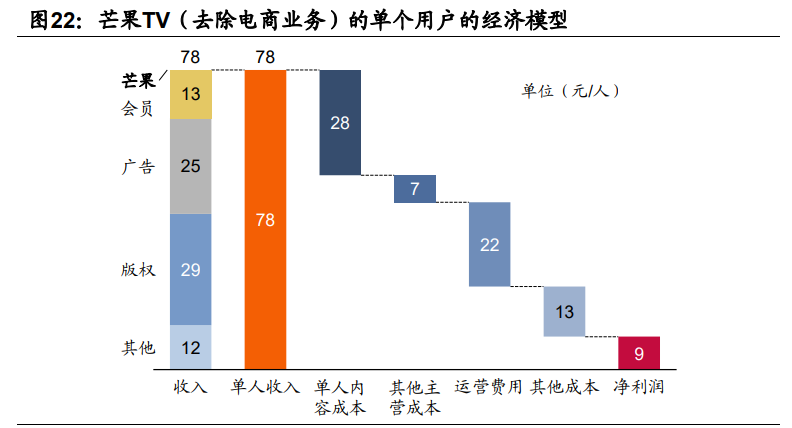 而成本端的结构则更加合理,其内容成本仅为28元/人,因此在此经营模型下,芒果超媒净利润为9元/人。通过单人经济模型的比较来看,爱奇艺和芒果超媒均是花费了70元/人左右的成本费用,但芒果主要是在产生收入的效率上远高于爱奇艺,因此得以实现盈利。