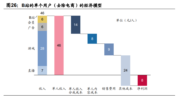 而按照以上框架对哔哩哔哩的经营模型进行拆解,可以发现哔哩哔哩的问题仍然是商业化程度不够。我除掉包含电商业务的其他收入后,哔哩哔哩单个MAU产生的收入约为46元/人,要远弱于芒果超媒的78元/人和爱奇艺的52元/人,而其中游戏贡献了28元/人,会员和广告收入各6元/人远低于行业的平均水平。另外还比较特殊的地方在于直播贡献了约7元/人。我们可以看出B站的收入结构相比爱奇艺和芒果来说是更加多元化的,而且也不像一个视频网站,更加近似于一个垂直社区。
