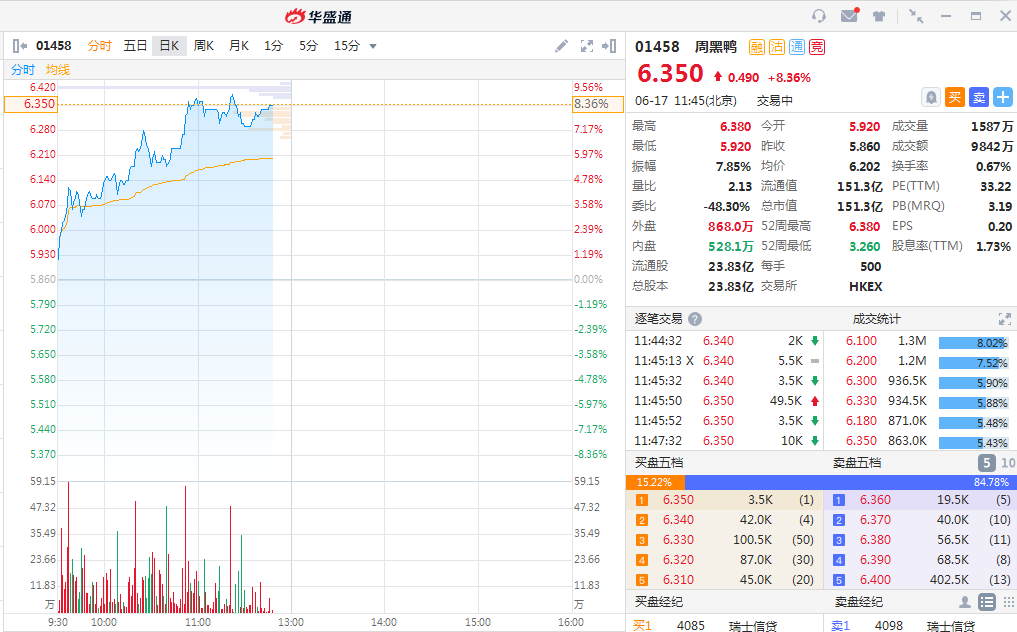 6月17日,周黑鸭(1458.HK)延续强势行情,现涨超8%,报6.35港元,最新总市值151亿港元。