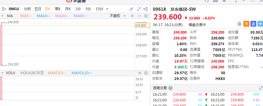 华盛资讯6月17日讯,京东集团-SW暗盘高开4.42%,截至16:21,报价239.6港元,涨幅6.02%,一手账面盈利680港元。最新成交额7250万港元,总市值为7085亿港元。