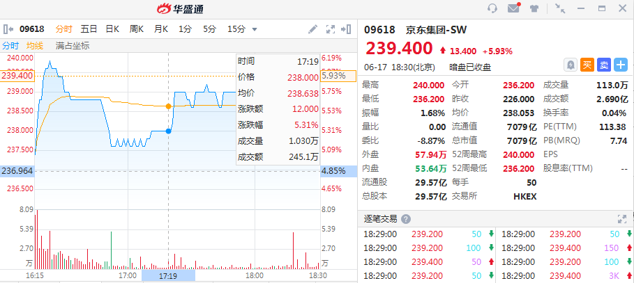 华盛资讯6月17日讯,京东集团-SW今日暗盘高开后涨幅稳定,最终收盘涨幅为5.93%,报价239.4港元,一手账面盈利670港元。最新成交额2.69亿港元,总市值为7079亿港元。京东将于明日正式挂牌港交所。