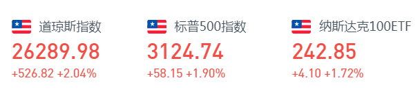 美国5月零售销售增幅创下史上最大单月涨幅,市场憧憬特朗普的万亿基建刺激计划,美股周二全线高开,道指盘初迅速涨逾800点。截至收盘,道指上涨526.82点或2.04%,报26289.98点;标普500指数涨58.15点或1.90%,报3124.74点;纳指涨169.84点或1.75%,报9895.87点。