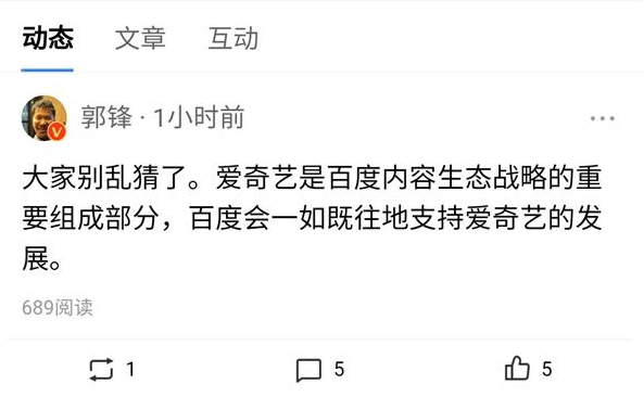 据报道,针对“百度拟向腾讯出售爱奇艺股权”一事,在百度App上实名认证为“百度公关总监”的郭锋回应称:“大家别乱猜了。爱奇艺是百度内容生态战略的重要组成部分,百度会一如既往地支持爱奇艺的发展。”此前有消息称,腾讯已与拥有56.2%爱奇艺股权的百度进行接触,商讨收购爱奇艺股份事宜。传腾讯计划成为爱奇艺最大股东,但具体购股规模尚未确定。