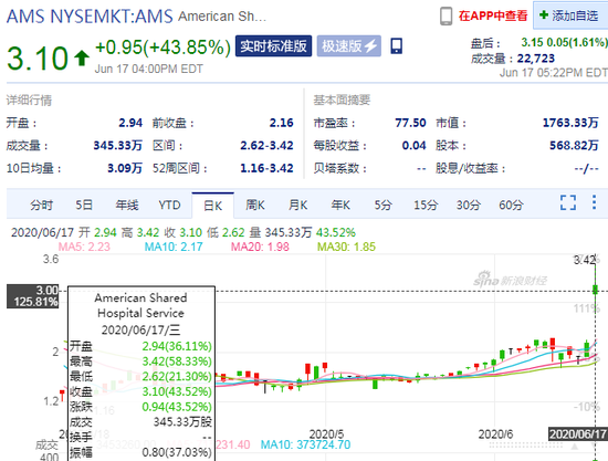American Shared Hospital Services在今天上涨了超过43%,最高涨超58%。该公司创始人为Earnest Bates.
