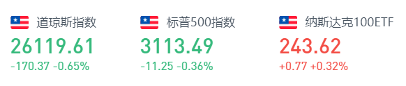 美股周三收盘涨跌不一,道指与标普指数结束三连涨。截至收盘,道指跌170.37点,报26119.61点,跌幅0.65%;纳指涨14.66点,报9910.53点,涨幅0.15%;标普500指数跌11.25点,报3113.49点,跌幅0.36%。