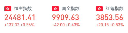 周三,恒指早盘涨0.08%,报24363.39点。截至收盘,恒生指数涨137.32点或0.56%,报24481.41点,全日成交额达1042.42亿。国企指数涨0.43%,报9909.63点,红筹指数涨0.53%,报3853.56点。