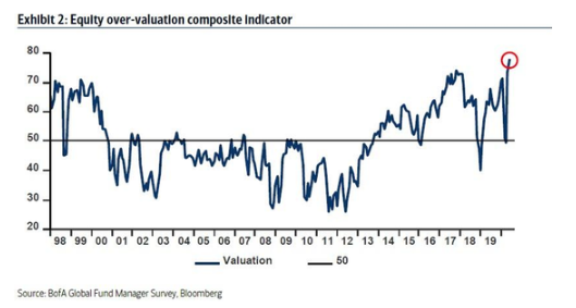 美银美林最新公布的6月全球基金经理调查显示,高达78%的投资者认为,全球股市从3月份的低点以创纪录的速度反弹后,市场被“高估”了,这也是1998年启动调查以来的最高水平,53%的受访者认为这是熊市反弹。