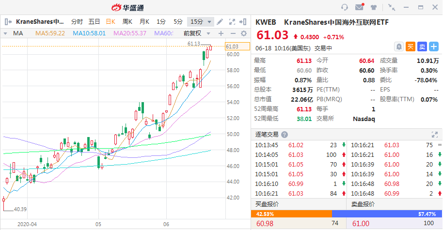 华盛资讯6月18日消息,美股盘初,热门中概股多数上涨,截至北京时间22:19,中概股ETF-KraneShares上涨0.71%,为连续第五日上涨。