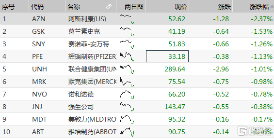 美股医药板块多数飘绿,阿斯利康跌超2%,诺和诺德、葛兰素史克、赛诺菲-安万特等有所下跌。