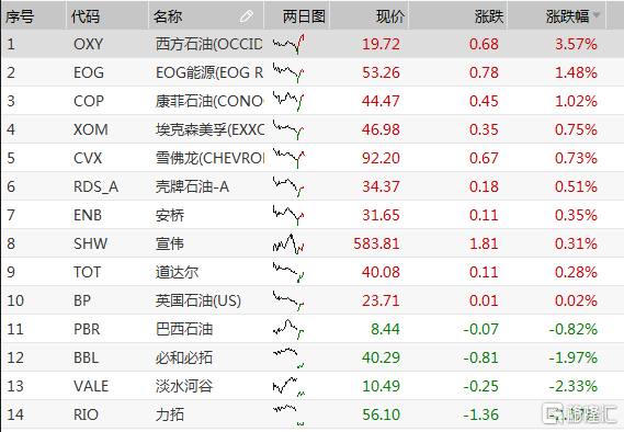而就整体盘面来看,美股多数概念板块显出分化之势。其中,美股能源股方面,其中,西方石油涨超3%,EOG能源、雪佛龙、康菲石油等跟涨,而淡水河谷、必和必拓、力拓等有所下跌。