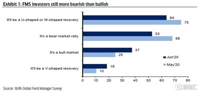 同时,有18%的受访者认为经济会V型复苏;而认为经济会出现U型或者W型复苏的人群比例则占到64%;且有37%的受访者认为,目前已进入了牛市;而53%的人指出,虽然美股开始反弹,但或依然处于熊市之中。