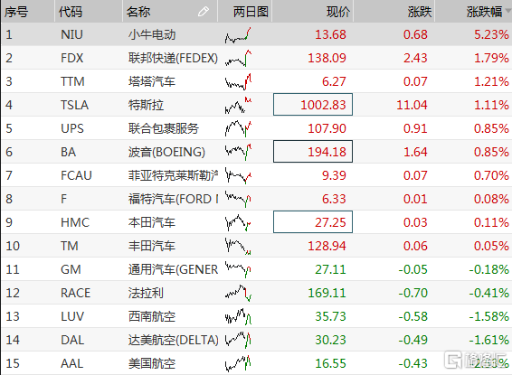 美股交通运输板块,小牛电动涨超5%,塔塔汽车、联邦快递、特斯拉等跟涨,而美国航空、达美航空、西南航空等有所跟跌。