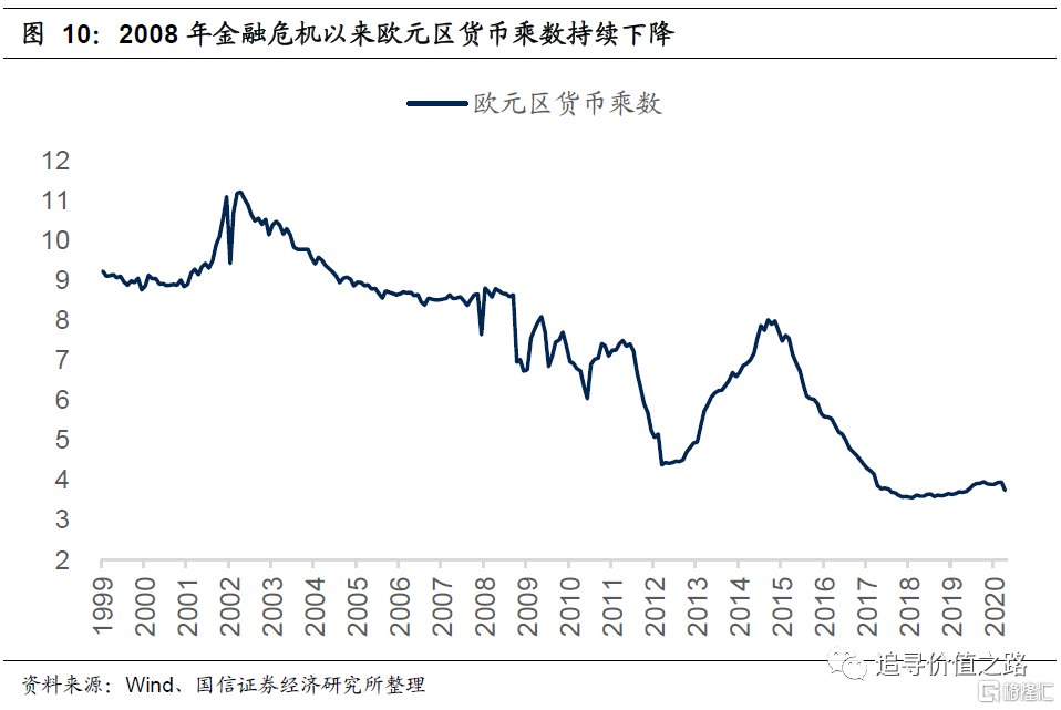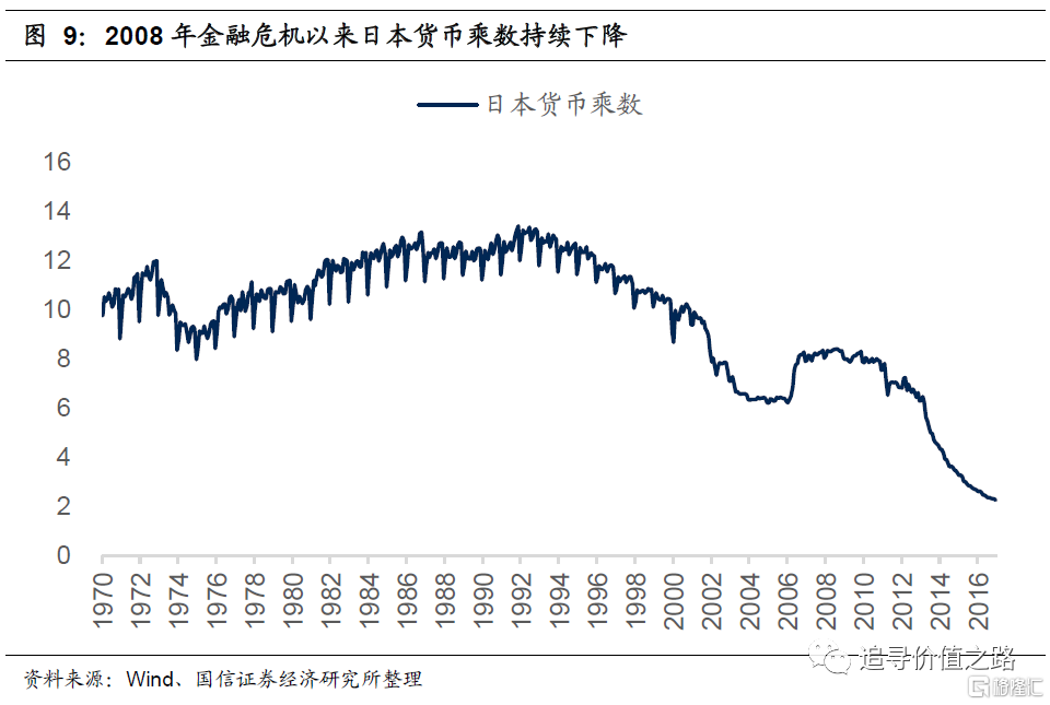 从图8、图9、图10中我们可以清晰的看到,2008年金融危机以后,美国、欧元区和日本的货币乘数都出现了明显的坠落,美国的货币乘数从危机前的9左右下降到了目前的4左右,欧元区的货币乘数从危机前的7.6下降到现在的3.7,日本的货币乘数从危机前的8下降到目前的2.2左右。