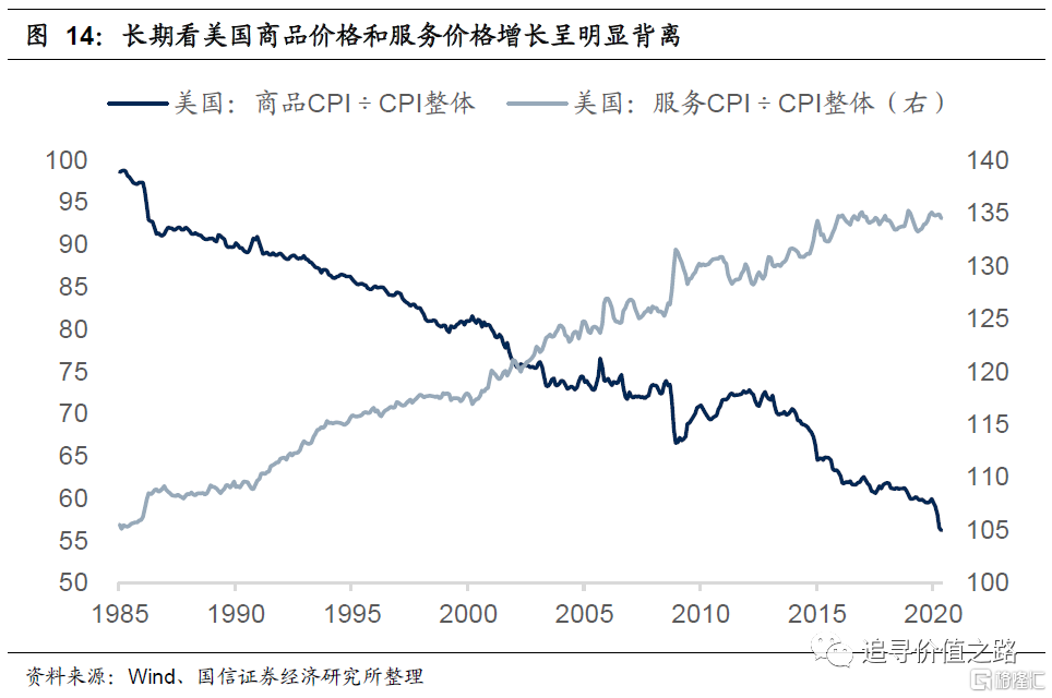 其二,最关键的实际上还是整个社会的生产效率的提高。这种整体生产效率的提高,一方面体现在工业商品生产能力的提高,另一方面很关键的是反映了经济从工业经济向服务经济的转变。经济发展过程中,服务在我们消费中的比例越来越大,有些服务商品是“非竞争性”的(“竞争性”是指一种商品你用了以后我就不能用了),典型的就是各类数字消费,影视、游戏、电子图书等,这些商品的边际成本几乎为零,供给是无限的,所以即使需求上升价格也不会持续上涨。而另一些有“竞争性”的服务商品,比如教育、医疗等,实际上价格就是在不断上涨的。