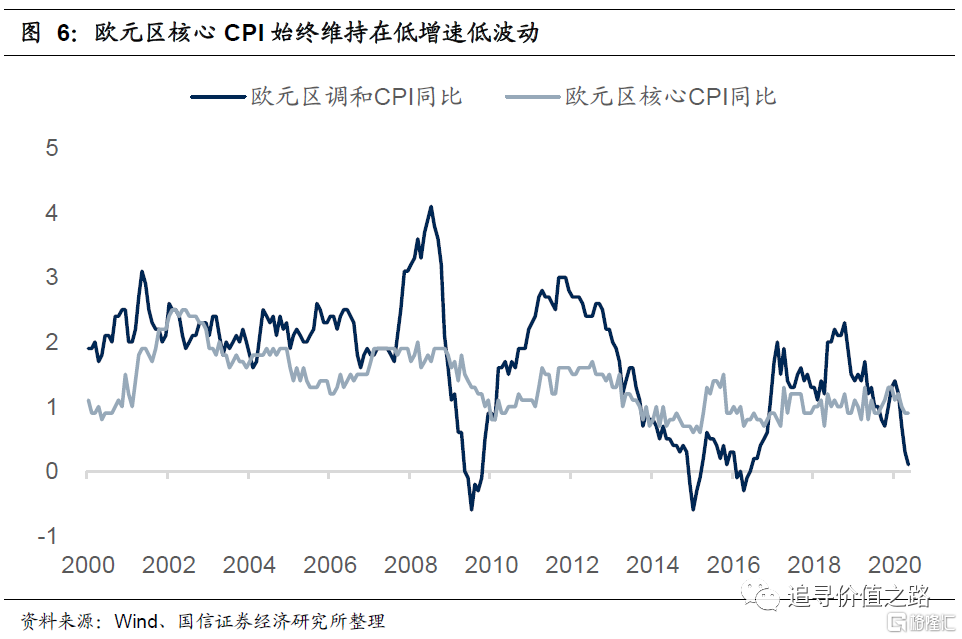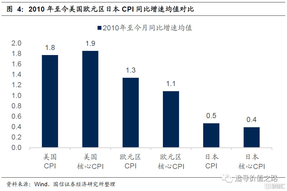 但是,无论西方国家货币政策如何宽松,通货膨胀似乎都很难再看到。从2010年至今,美国CPI的月同比增速均值是1.8%(核心CPI月同比均值1.9%),欧元区CPI月同比增速均值是1.3%(核心CPI是1.1%),日本的CPI月同比增速均值更低只有0.5%(核心CPI仅0.4%)。