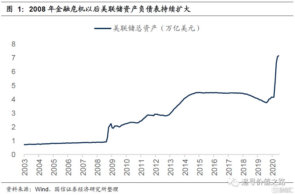 以2007年12月全球金融危机前的时点为基准的话,当时美联储资产负债表的总资产是0.89万亿美元,当前(2020年6月中)美联储表上的总资产是7.17万亿,比危机前增加了6.3万亿,是当时的8倍。