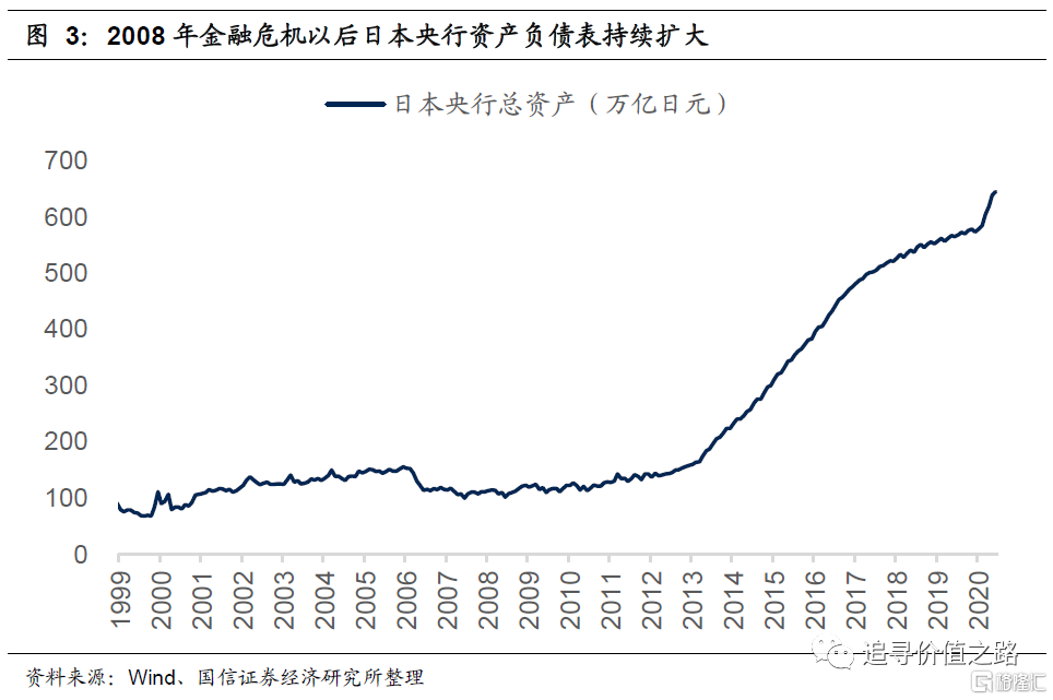 日本央行在金融危机以后几乎是不停歇地连续地实施货币宽松政策,2007年12月金融危机前日本央行的资产负债表总资产规模是111万亿日元,到2020年6月中旬,这个数字已经扩大到534万亿日元,是当时的5.8倍。