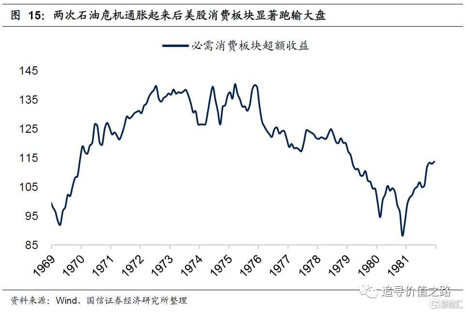 所以我们看到,无论国内还是国外,每每通货膨胀真的起来以后,消费板块总体上是跑输大盘的,比如1974年石油危机以后,美股的必须消费板块明显跑输大盘,再比如,最近几年A股的消费股大行情也是在通胀极低的环境中实现的。