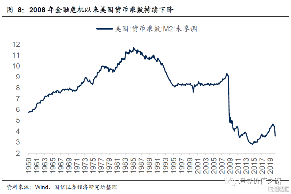 换言之,中央银行释放的大量货币流动性,停留在了金融系统之中,而没有进一步传导到实体经济,使得企业主体和居民个人获得货币从而提高购买力。从经济数据上来看,这个现象集中体现在货币乘数的大幅下降。