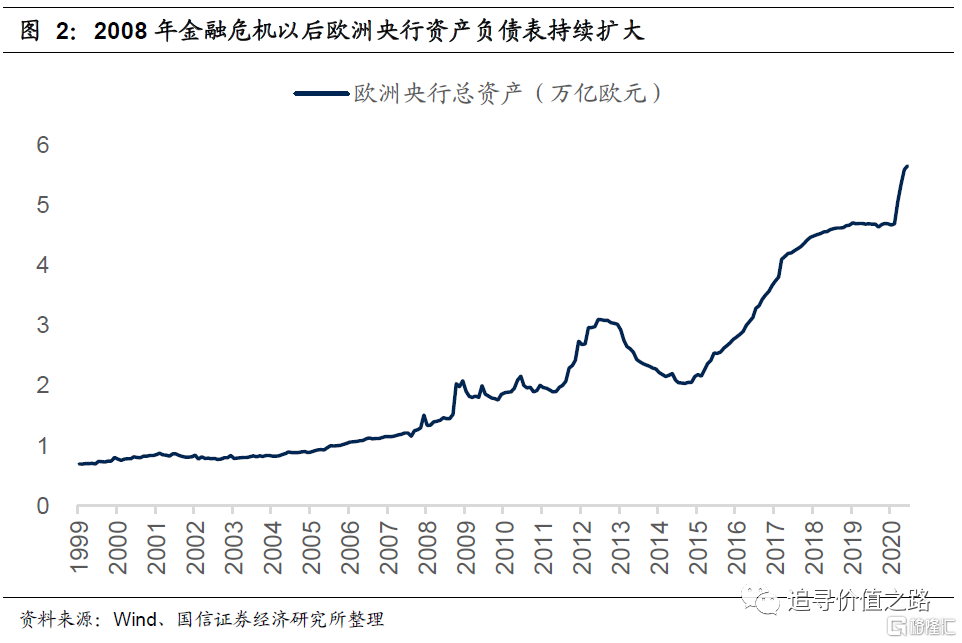 欧洲央行危机前2007年12月的资产负债表总资产是1.5万亿欧元,当前是5.6万亿欧元,相比危机前欧洲央行扩表4.1万亿美元,是当时的3.7倍。