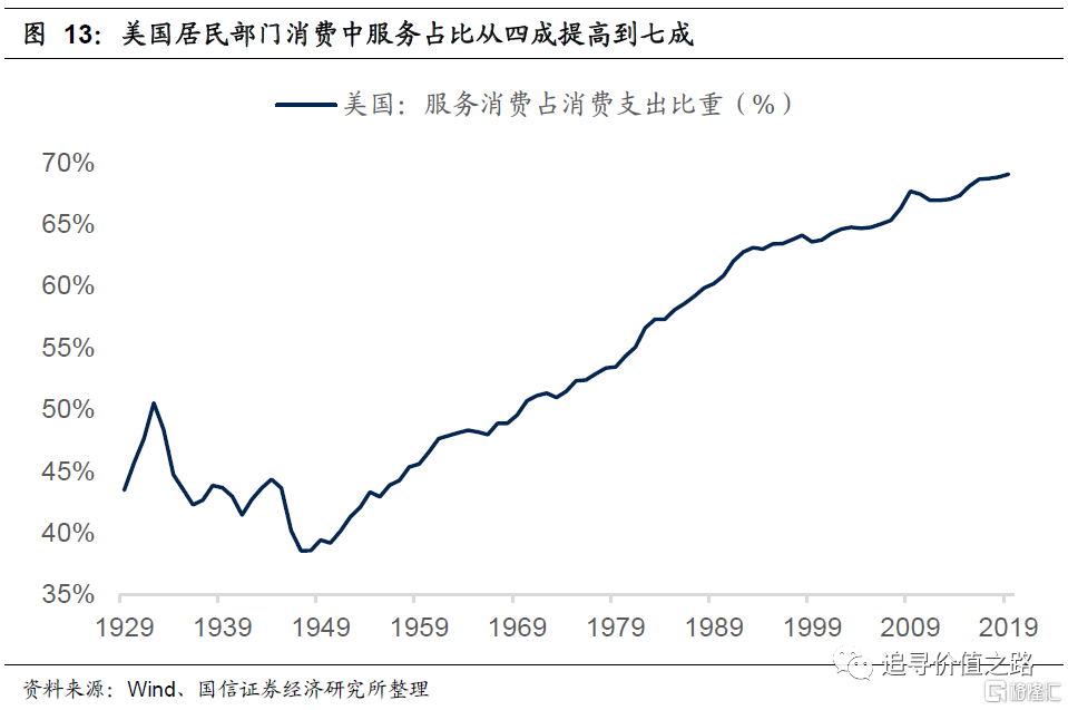 第三产业占GDP的比重越来越大,意味着居民消费会越来越多的从商品消费转向服务消费,以成熟经济体美国为例,美国居民部门消费支出中服务消费的占比已经从二战后的不到40%提升到现在的70%左右。