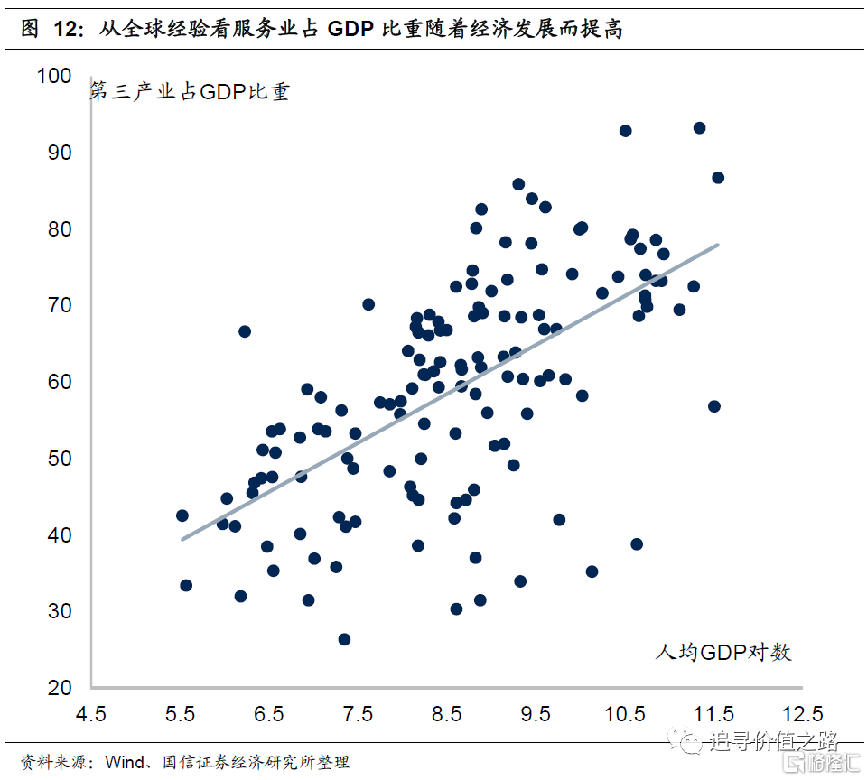 从全球各国的经济发展历史经验来看,随着经济发展水平的不断提高,GDP中第三产业(服务业)的占比会不断提高。下图的散点图报告了世界主要国家人均GDP和服务业占GDP比重的对比,可以很清晰地看到,两者之间有很强的正相关关系,即随着人均GDP的提高,服务业占GDP的比重会上升。中国的情况也是如此,2012年中国的国内生产总值中第三产业占比首次超过第二产业,当年第三产业占GDP比重达到45.5%,高于第二产业的45%。
