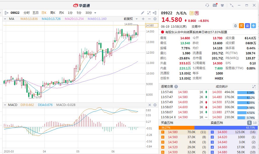 九毛九今日股价大涨逾6%,市值突破200亿港元,较今年3月低点,股价已翻倍。
